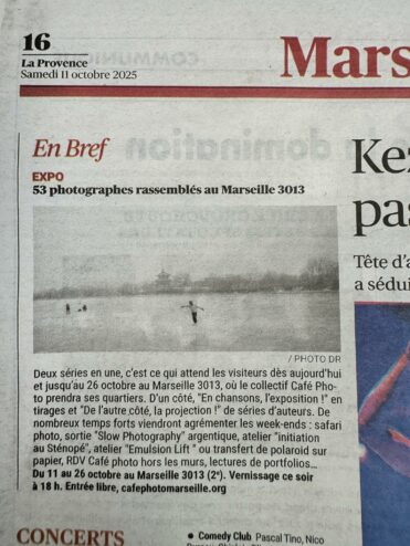 Tarifs : 35€ pour les extérieurs / 25€ pour les adhérents CPM – Le tarif inclut la fourniture d’une pellicule NB argentique 400ASA (12 ou 24 poses selon le format) et le développement du film chez un de nos partenaires. Uniquement sur réservation par mail à cafephotomarseille@gmail.com / Limité à 10 places.